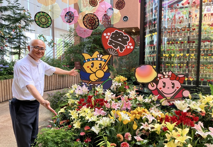 ユリのイエローウィンやソルボンヌなど7品種100本。ダリアやハイビスカスなど130鉢とともにチューリップとともに飾られています。花と空間装飾と併せて夏の気分を感じてください。皆さん、ぜひお立ち寄りください。